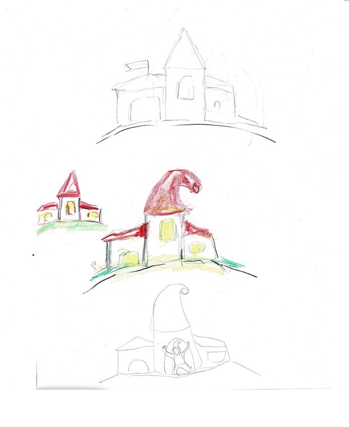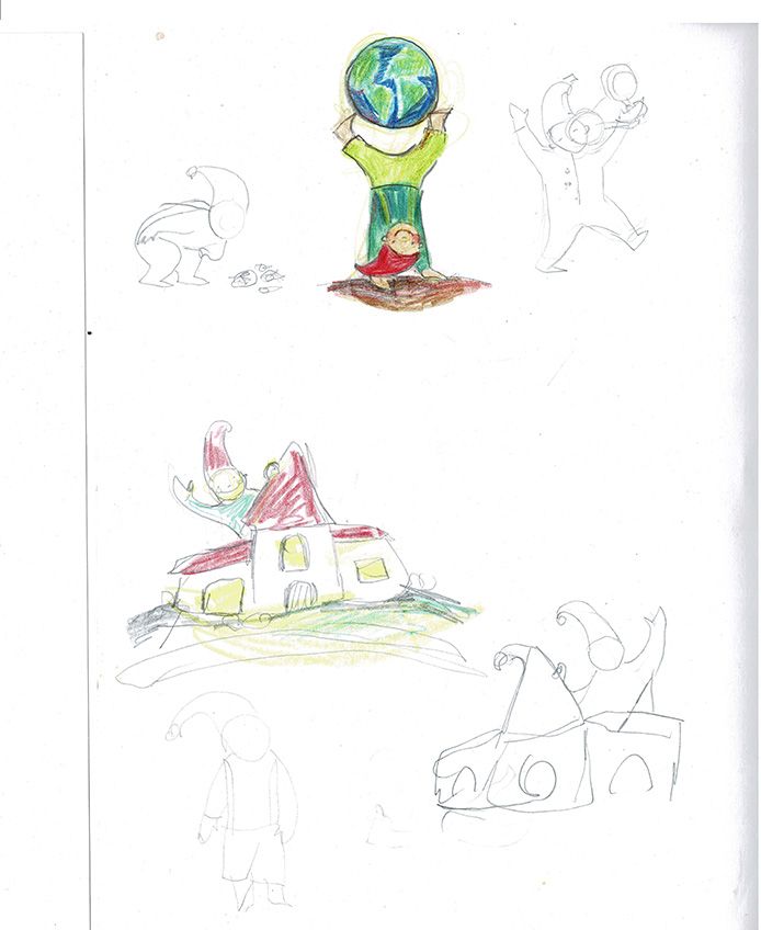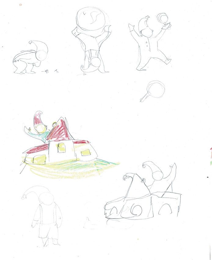 Jede Zeichnung beginnt mit einer Skizze – hier sehen Sie die Entwicklung unserer Wichtelwelt.