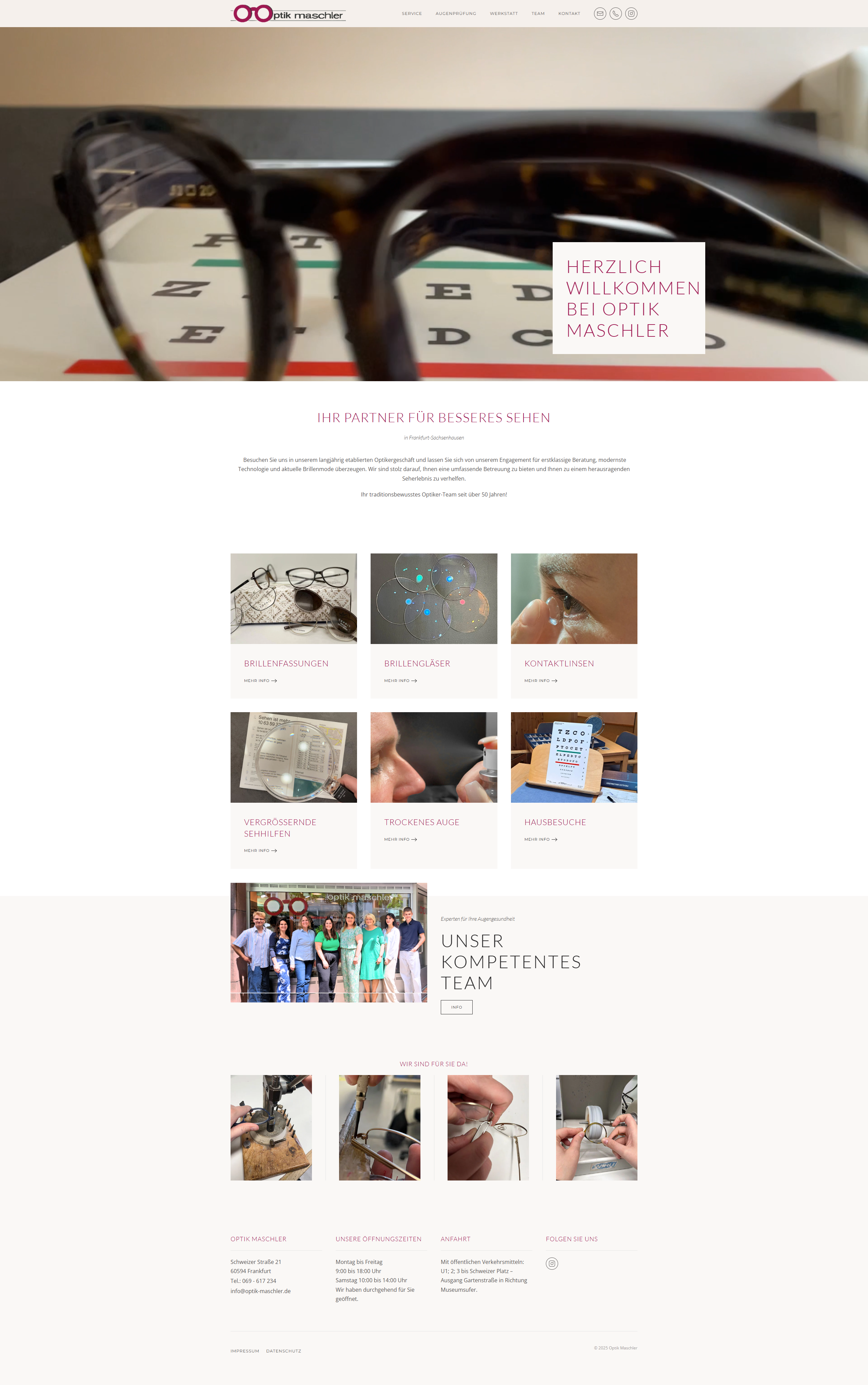 Das Redesign bringt Eleganz und Übersichtlichkeit. Große Bilder, sanfte Farben und eine moderne Struktur schaffen ein einladendes und professionelles Erlebnis, das die Qualität und Expertise von Optik Maschler perfekt vermittelt.